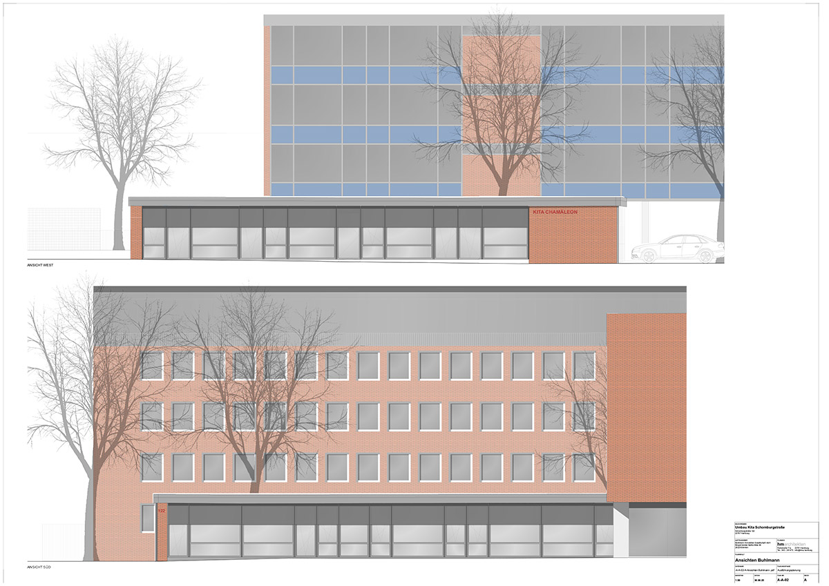 In Hamburg-Altona, zwischen der Max-Brauer-Allee, Willebrandstraße und Schomburgstraße, entsteht in einem bestehenden Büroensemble aus den 1960er Jahren eine neue Kindertagesstätte mit rund 60 Betreuungsplätzen. Der eingeschossige Pavillon, der die beiden mehrgeschossigen Bürogebäude an der Max-Brauer-Allee und der Willebrandstraße verbindet, wird hierfür umfassend umgebaut und neu strukturiert.